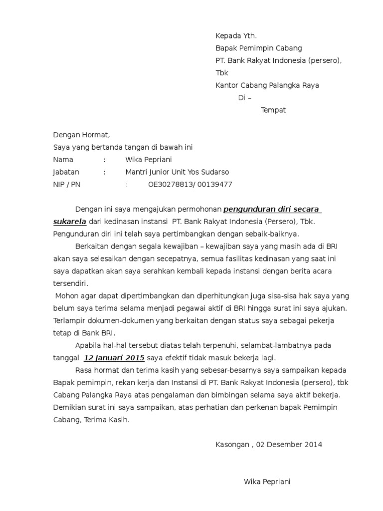 Contoh permohonan pengunduran diri kerja karyawan kontrak. Surat pengunduran diri ini adalah surat yang penting untuk dibuat saat anda membuat keputusan untuk mengundurkan diri dari perusahaan tempat anda bekerja. Bekerja merupakan kegiatan setiap orang setelah menempuh pendidikan. Saya mengucapkan terimakasih atas kesempatan yang diberikan kepada saya untuk bekerja di. Surat pengunduran diri berisi pernyataan pengunduran diri seseorang dari suatu jabatan karena faktor tertentu yang akan disampaikan kepada atasan atau pemimpinnya.